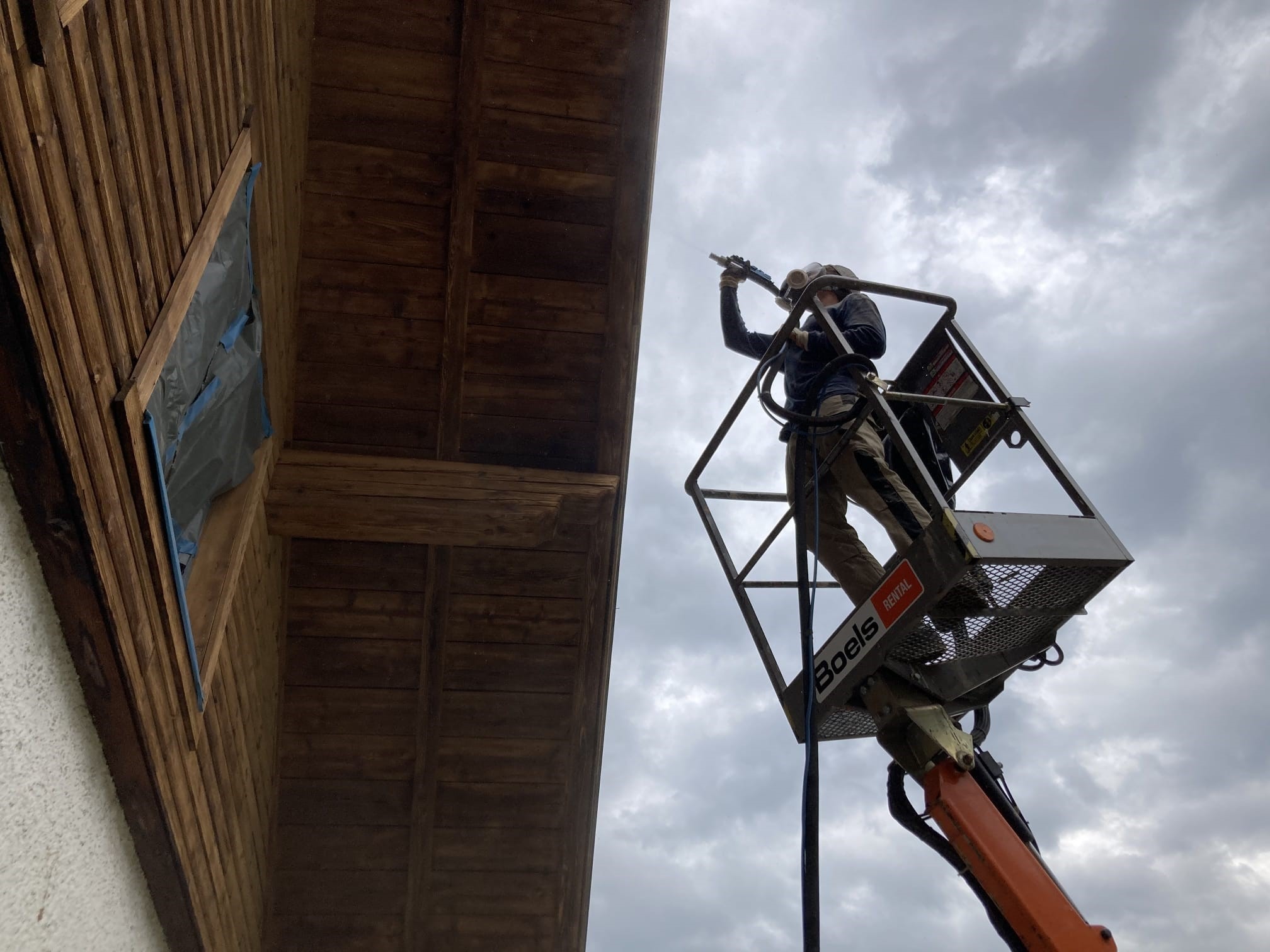 Was wir strahlen: hauptsächlich Holzfassaden, Holzvertäfelungen, Balkone, Dachbalken, Terrassen sowie Holztreppen & Möbel. Gerne sehen wir uns auch andere Aufträge an!